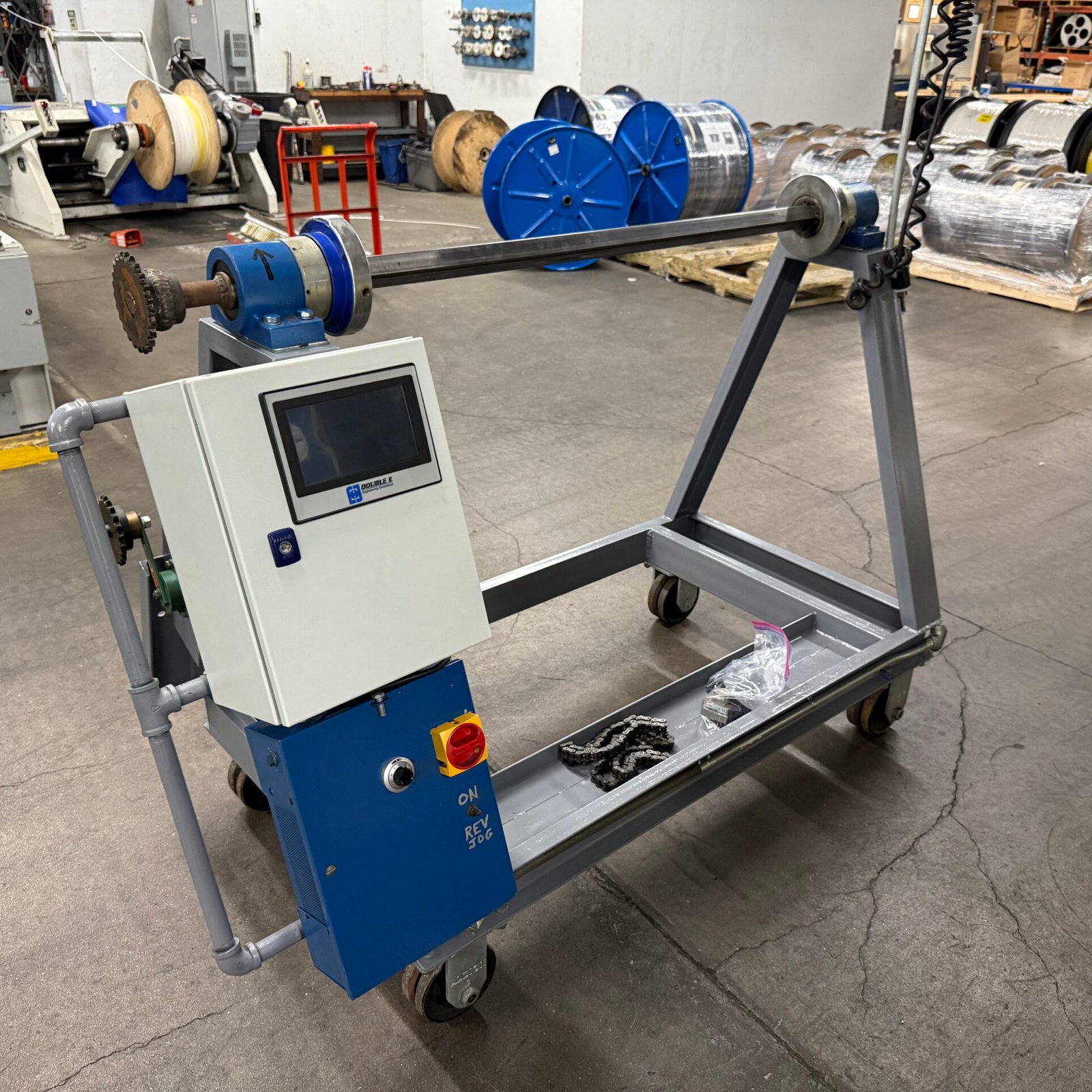 Electron Technologies Corporation approached DXM Design Works in search of completing the modification and installation of a critical piece of automation equipment for their manufacturing process. The ‘payout’ and ‘take-up’ for Electron Technologies’ spool management system was narrowed by DXM to improve the weight capacity of the device. The automation, electronic uninstallation, and reinstallation were handled by DXM, as well as all cutting, welding, painting, reassembly, and delivery. DXM is now working with Electron Technologies to complete the installation of the automated equipment on their manufacturing line and programming process recipes.
